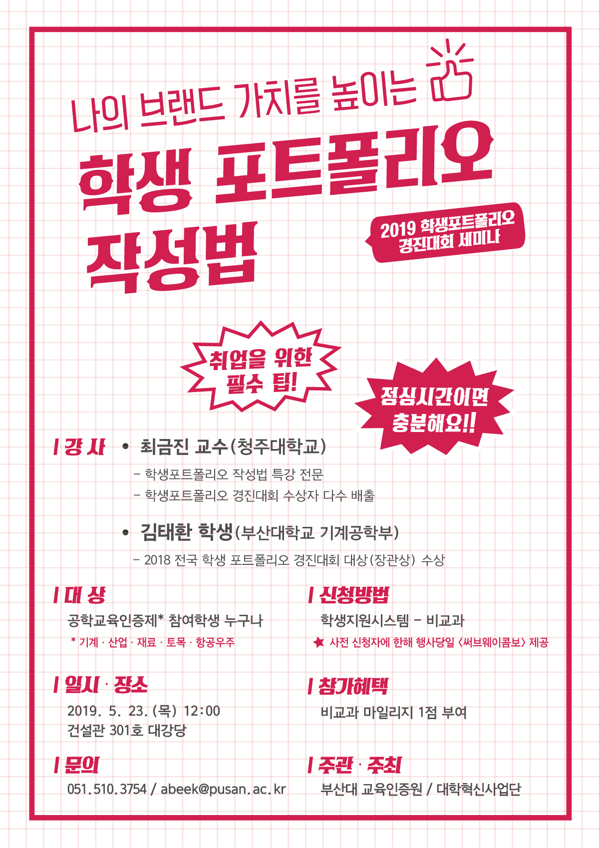 취업을 위한 필수 팁! 점심시간이면 충분합니다. 관심있는 학생들의 많은 신청 바랍니다.